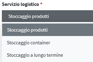 2. Il campo Servizio logistico serve a identificare il tipo di attività di stoccaggio a cui si riferisce la tariffa. La selezione determina il contesto operativo e può influenzare il modello di prezzo e le regole applicabili :