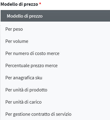 3. Il campo Modello di prezzo serve a definire la logica con cui viene calcolata la tariffa per il servizio logistico selezionato. La scelta del modello incide direttamente sul modo in cui il sistema applica i costi alle operazioni di magazzino o spedizione: