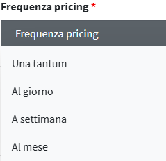 7. Il campo Frequenza pricing serve a definire con quale cadenza temporale viene applicata la tariffa configurata. La selezione incide direttamente sul calcolo dei costi e sulla periodicità della fatturazione o del conteggio: