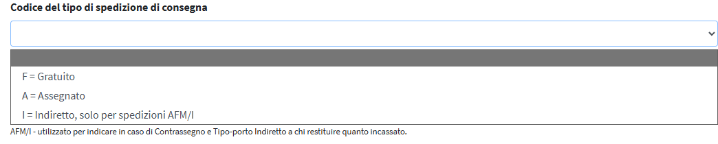 • I = Indiretto (solo per spedizioni AFM/I) : Questo valore è utilizzato esclusivamente per spedizioni di tipo AFM/I, in cui il pagamento del trasporto è gestito in modo indiretto. È impiegato, ad esempio, per spedizioni in contrassegno o tipo-porto indiretto, quando occorre specificare a chi restituire l’importo incassato.
