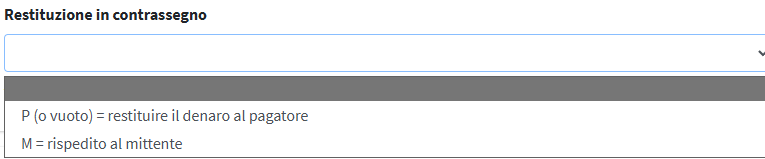 • P (o vuoto) = Restituire il denaro al pagatore : Questa è l’impostazione predefinita. Significa che l’importo riscosso dal corriere verrà restituito alla persona o entità che ha effettuato il pagamento. Viene utilizzata quando il destinatario stesso è il soggetto legittimato a ricevere l’eventuale rimborso o accredito.