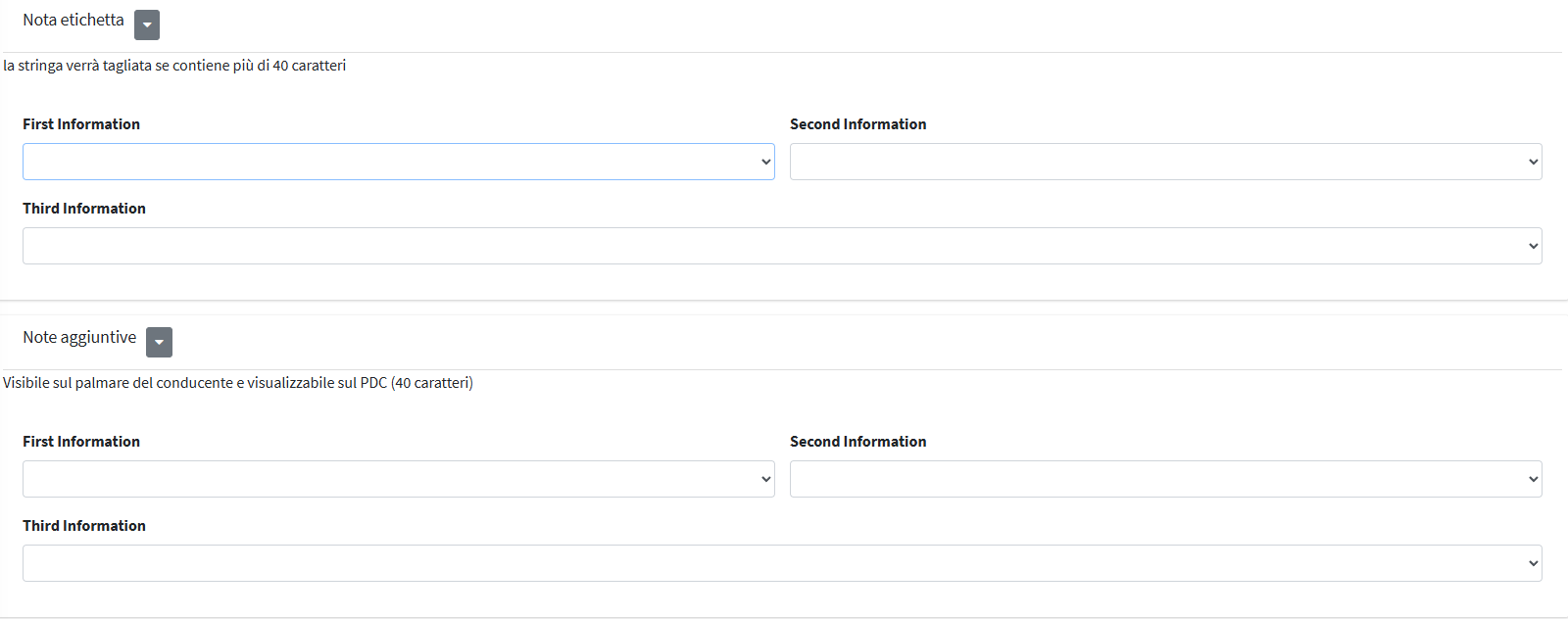 Entrambe le aree funzionano in modo analogo: consentono di selezionare fino a tre campi informativi (First, Second e Third Information) che verranno concatenati in un’unica stringa.