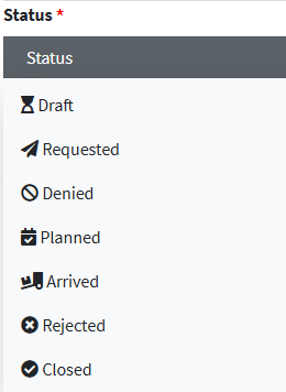 7. When inserting or updating an arrival, the Status field must be selected from the drop-down list. Each status identifies the phase of the logistics process: