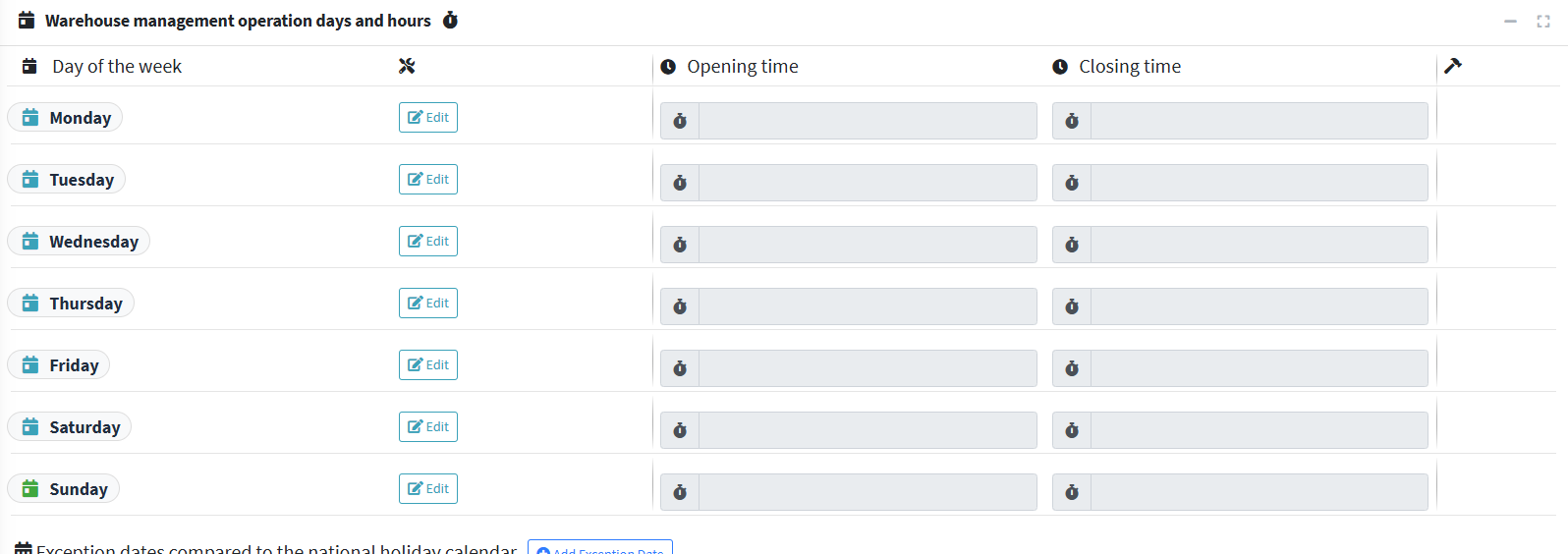 - Opening/Closing Hours: After clicking Edit , enter the start and end times (e.g., 8:00 AM – 6:00 PM). You can change the hours for each day. You can leave this field blank for days when the warehouse is closed.