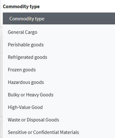 16. In the Commodity Type drop-down menu , choose from the following options: