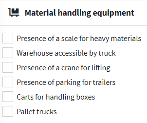19. In the Material Handling Equipment section , there are options describing the accessibility and tools present: