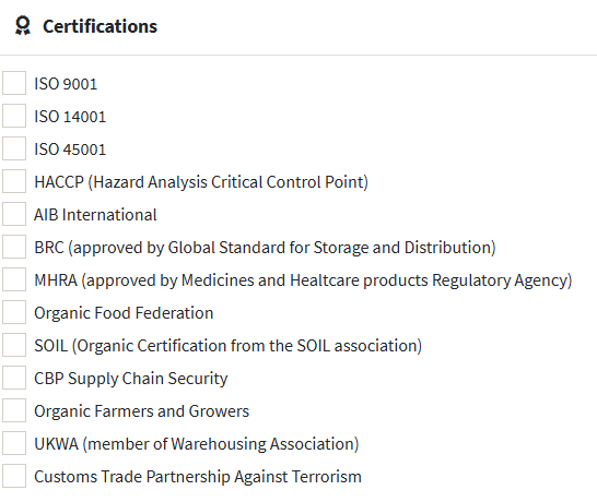 22. In the Certifications section, select the certifications held by the warehouse, which are important for ensuring quality and regulatory compliance: