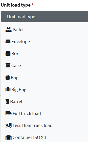 - Load unit type : Category of the unit, selectable from the list (e.g. Pallet , Package ).